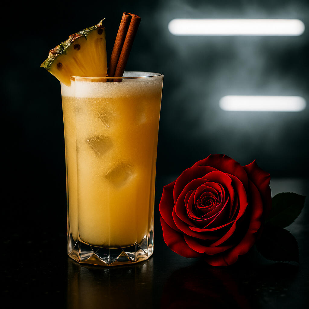 Golden sunlight pours into the glass as fresh pineapple juice glows like liquid amber, its tropical sweetness rushing forward with the first sip. The crisp bite of vodka carries the fruit’s brightness, but it’s the whisper of cinnamon that turns the familiar into something spellbinding—warm, spiced, and unexpected. The spice curls at the edges of the tongue, lingering like a secret while the pineapple sparkles sharp and sweet.It’s sunrise in a glass—bright, exotic, and kissed with fire.